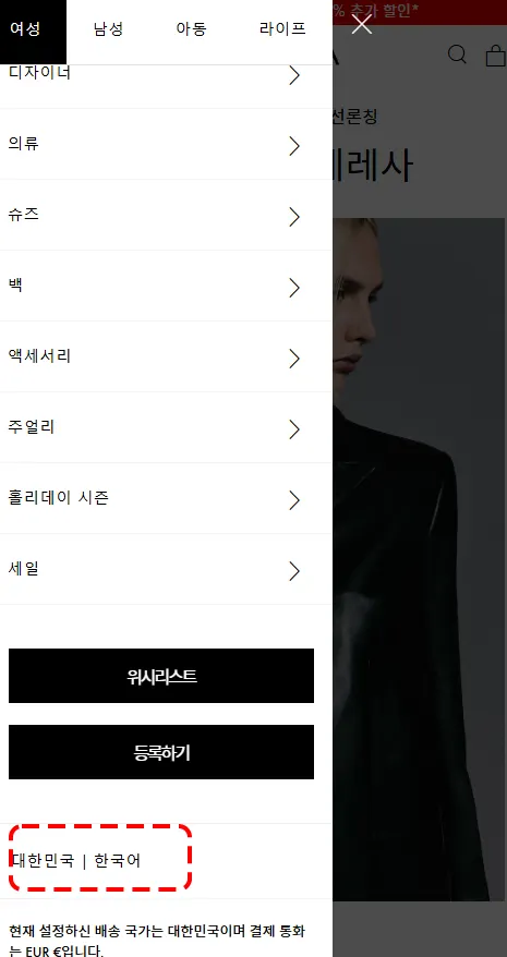 어플: 앱 메뉴 하단 → 배송지 및 언어선택 (원하는 지역)